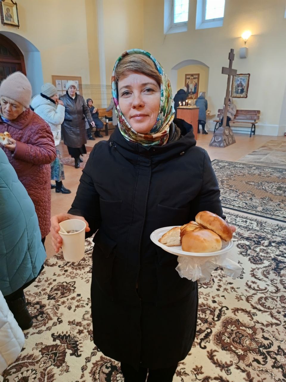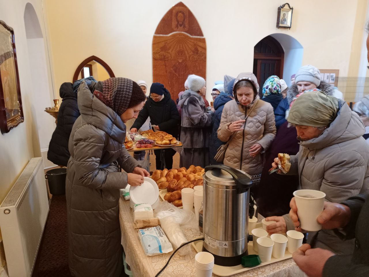 После службы всех щедро угощали на праздничной трапезе: постными пирожками, сладкими пирогами и горячим чаем.